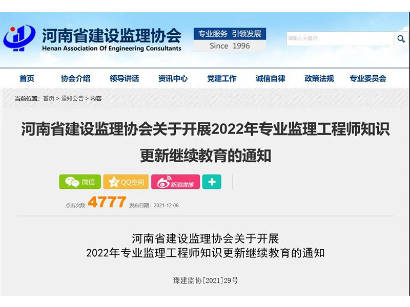 【通知公告】河南省建設(shè)監(jiān)理協(xié)會關(guān)于開展2022年**監(jiān)理工程師知識更新繼續(xù)教育的通知詳情>>
