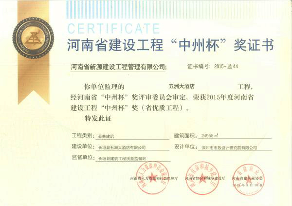 熱烈祝賀我公司監(jiān)理的五洲大酒店項(xiàng)目榮獲2015年度河南省建設(shè)工程“中州杯”獎(jiǎng)(省優(yōu)質(zhì)工程),總監(jiān)宋電君,監(jiān)理工程師劉俊杰。